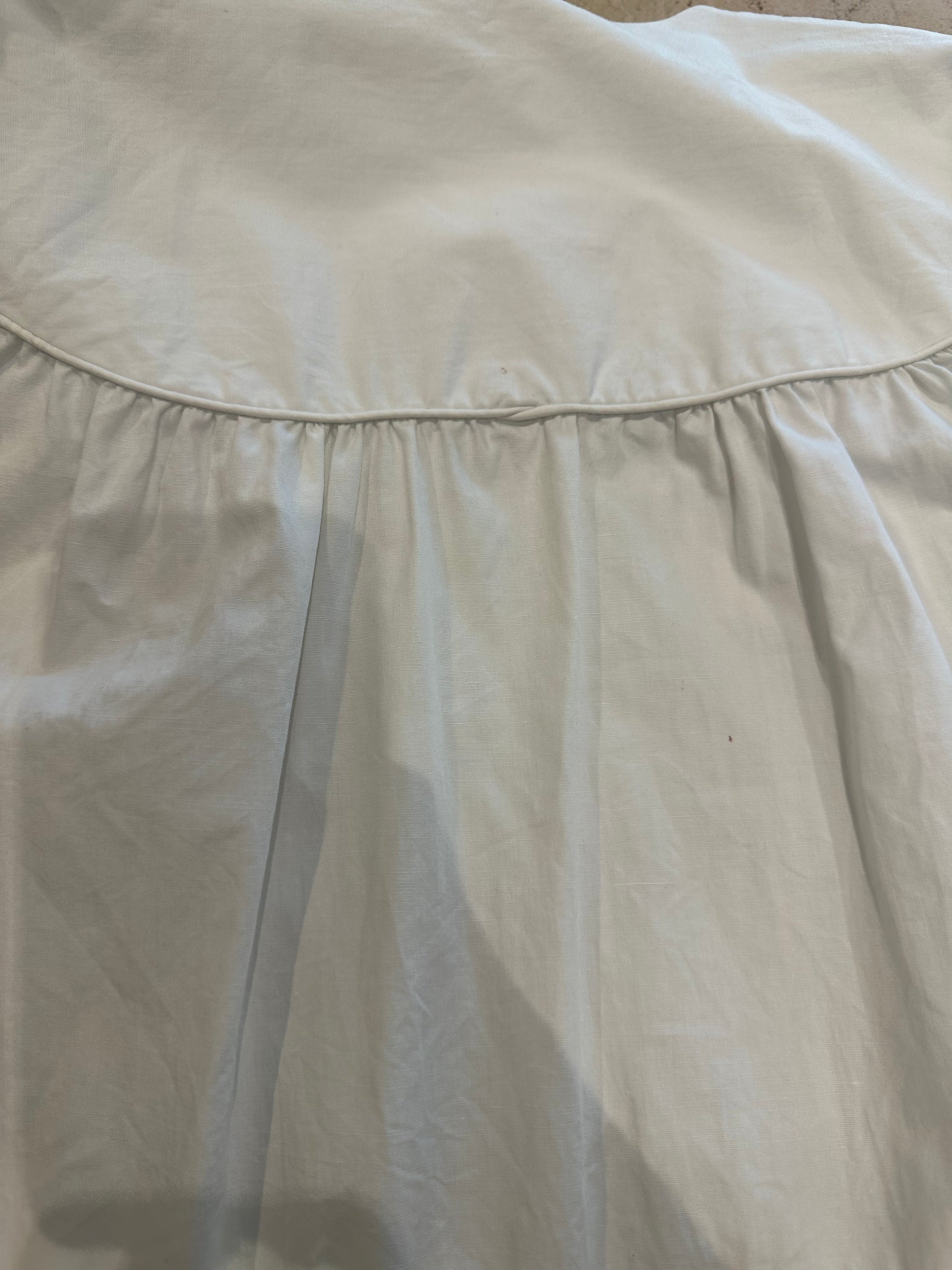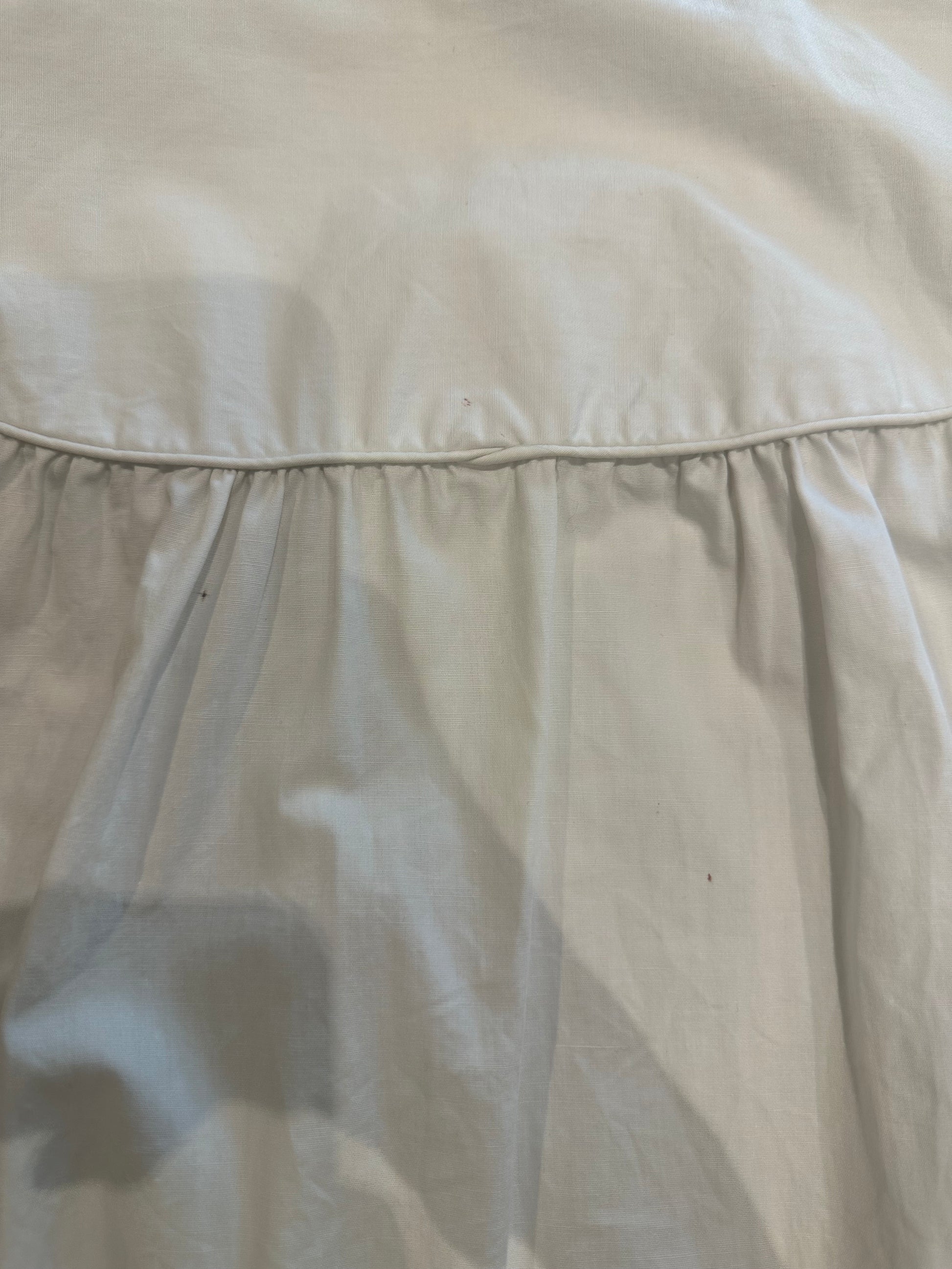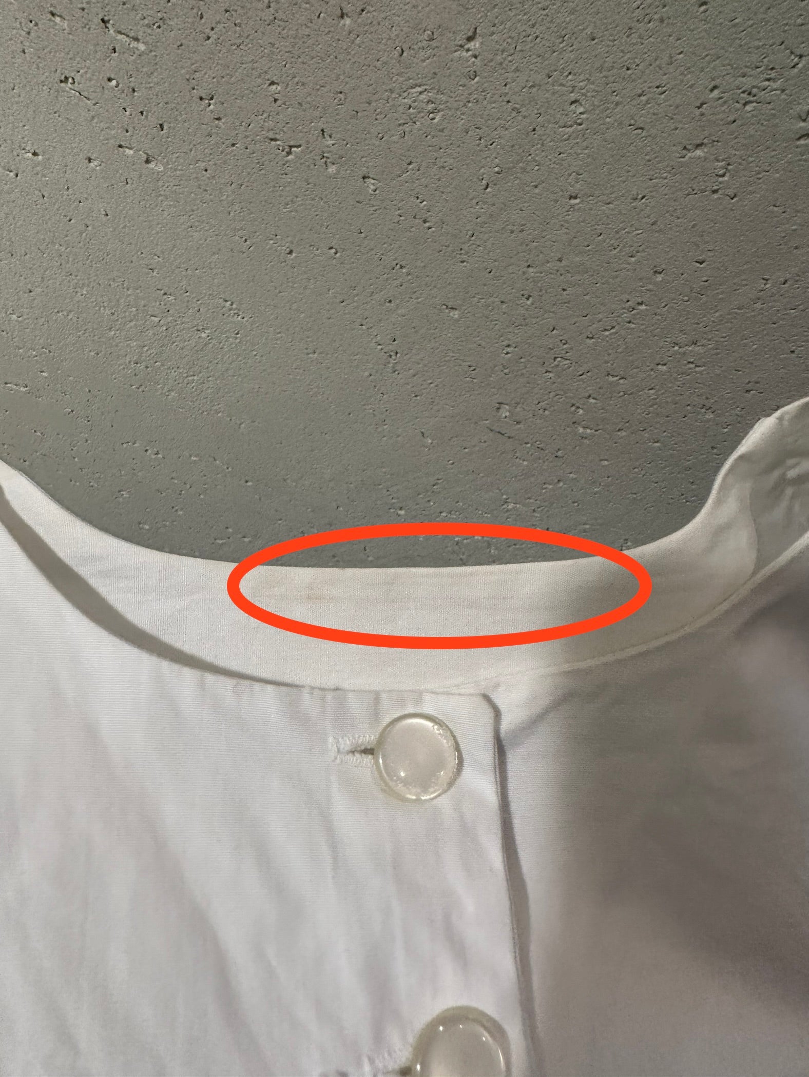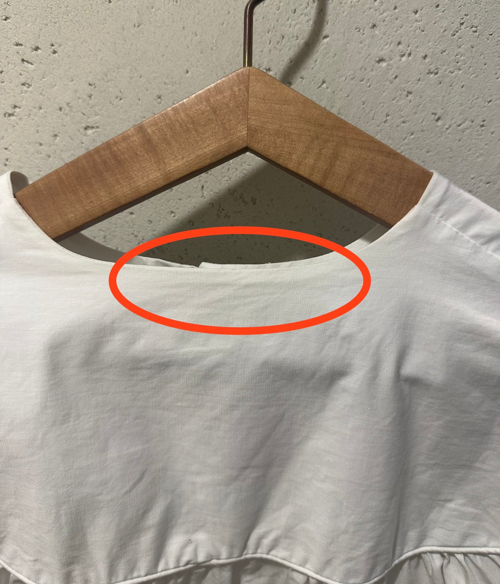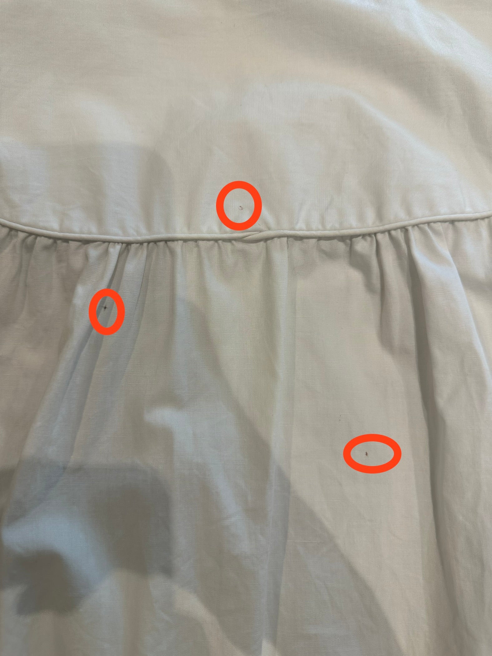[ダメージの有無]薄く目立ちにくい程度かと思いますが、首元の内側と外側に薄い汚れあり。背中に約1mm程度のインク系のような跡が3箇所程度あり。その内の1箇所(丸で囲んだ左側の跡)は、ギャザーが重なる部分のため、見えにくい部分です。年代による状態にご理解の上お求め頂けますようお願いします。
