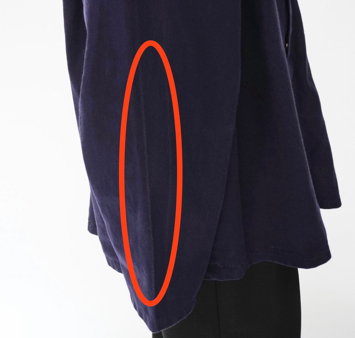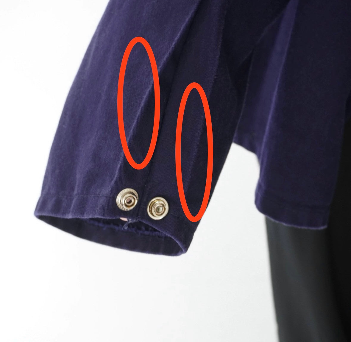 [ダメージの有無]状態良好ですが、腕の外側に薄い線の跡があります。(汚れではなく、平置きで畳んだ際に跡がついたもの)目立ちにくいですが、袖先内側のスナップボタンの生地をたたむ部分にも、同じような薄い線があります。画像をご確認ください。