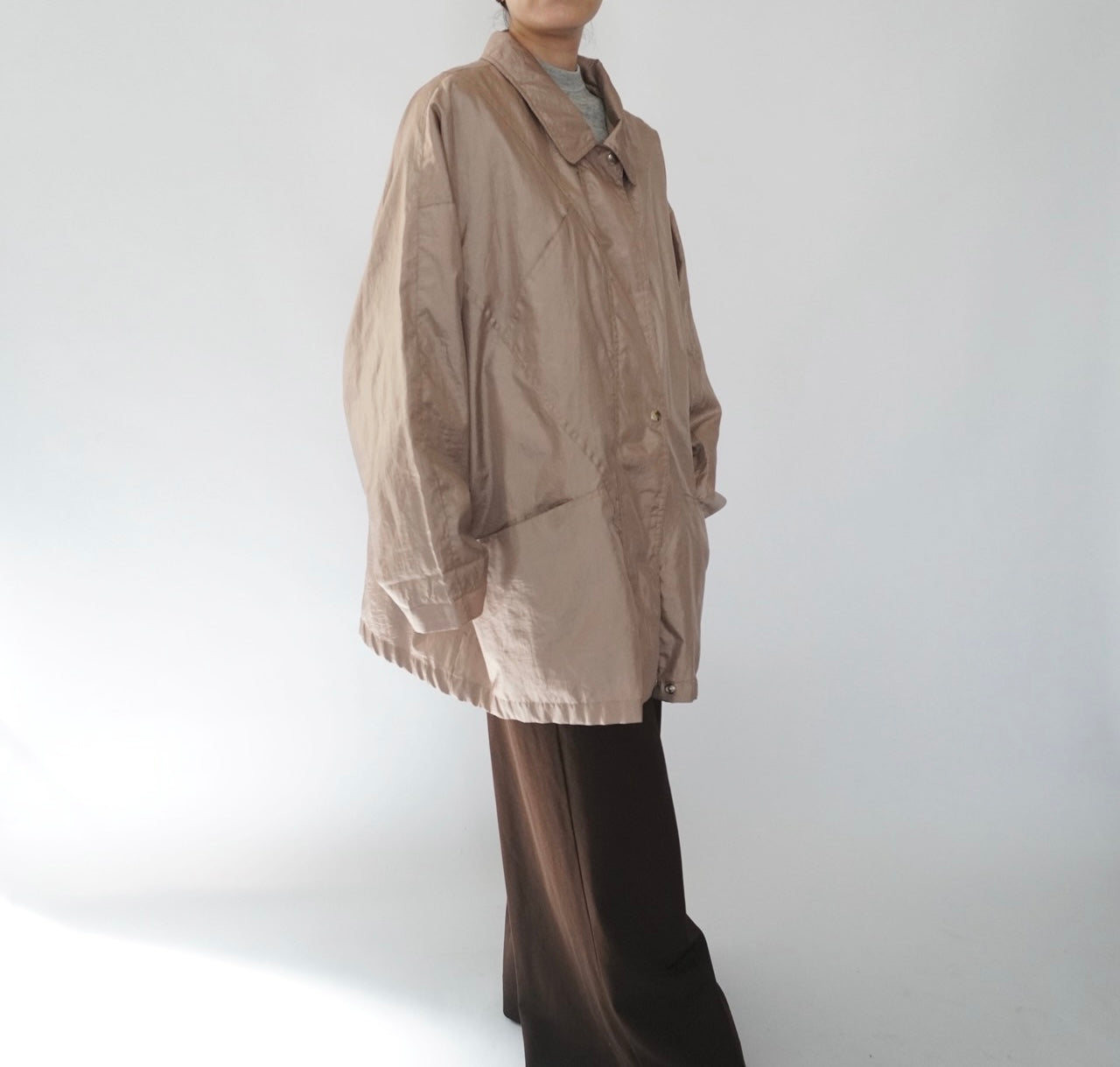 オーバーサイズシルエット(サイズをご確認ください)薄手ですが、ニットなど重ね着しやすいシルエットかと思います。